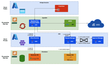 Frontend využívá možností škálování Azure Kubernetes Service, následně volá java aplikaci nasazenou v Redhat Openshift v on-premise prosředí. Číselníky jsou uloženy v NoSQL databázi a žádosti o dotace jsou uloženy v MS SQL serveru. Samotné předání žádosti a informace o schválení probíhá v .NET komponentě, která komunikuje asynchroně přes messaging kafka.